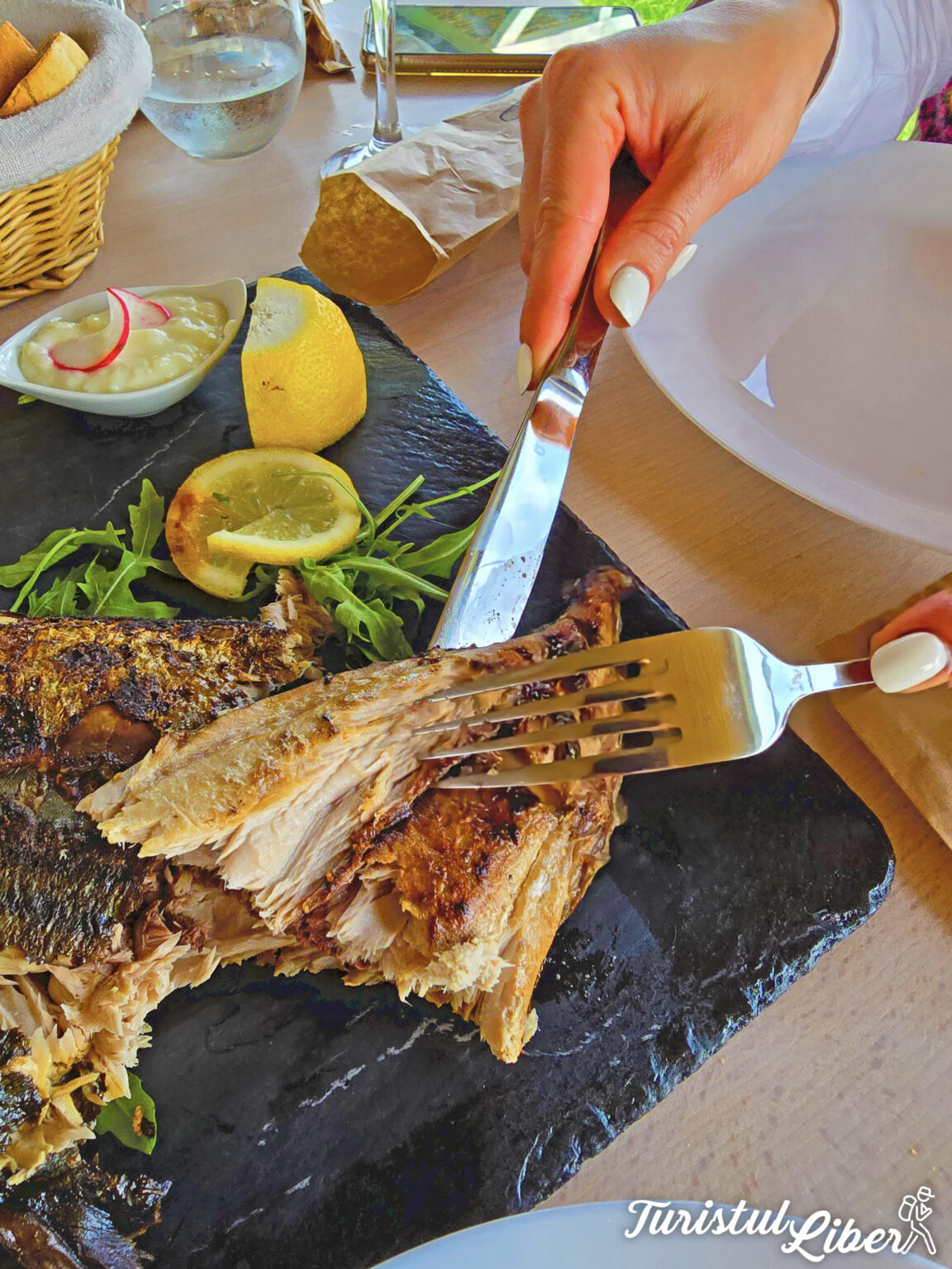 Noi ne-am delectat aici cu un platou de aperitive pescărești, pentru că am vrut să gustăm câte un pic din toate. Nu ne-am putut decide cu ce să începem dintre hamsia marinată, midiile pane, calamarul pane, zacusca de pește, peștele afumat sau icrele de crap. Dar un lucru este cert – zacusca de pește ne-a rămas mult timp în memoria papilelor gustative.